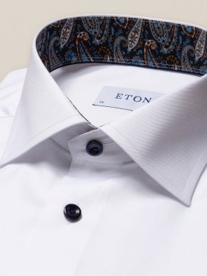 ETON SHIRT – WHITE ORGANIC COTTON SIGNATURE TWILL WITH PAISLEY TRIM